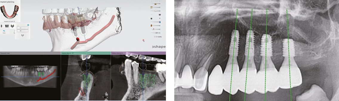 デジタルデータで手術計画を作成します。シミュレーションを通し最適位置を設定し、患者様専用のサージカルガイドを製作して手術を行います。デジタルシミュレーションにより骨の見えない部分や神経まで、詳細に診断でき、正確なインプラント埋入の位置、方向を決めることができ安全に手術が行うことが出来ます。